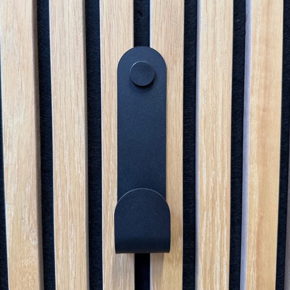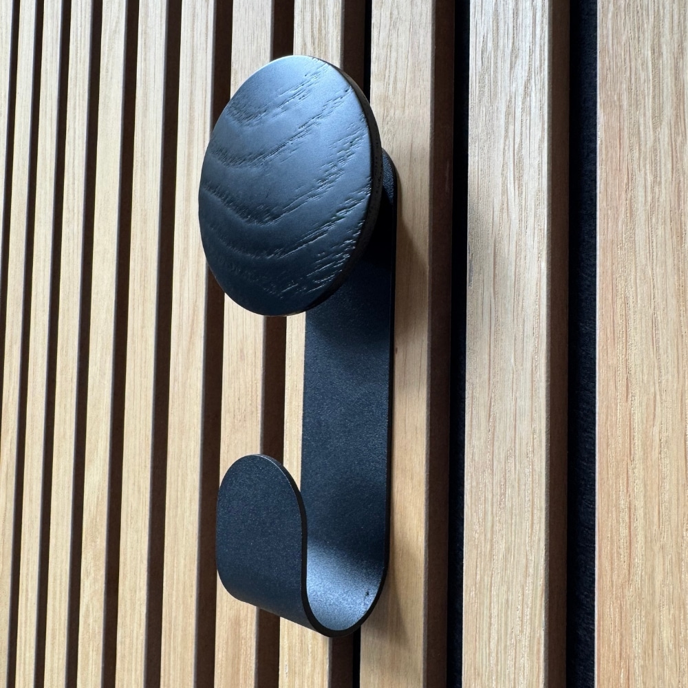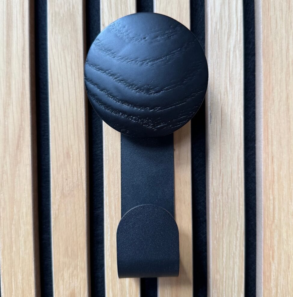 Alle hangers zijn gemaakt van verzinkt staal en hebben een duurzame poedercoating. De houten knop is gemaakt van eikenhout dat zwart geverfd is.